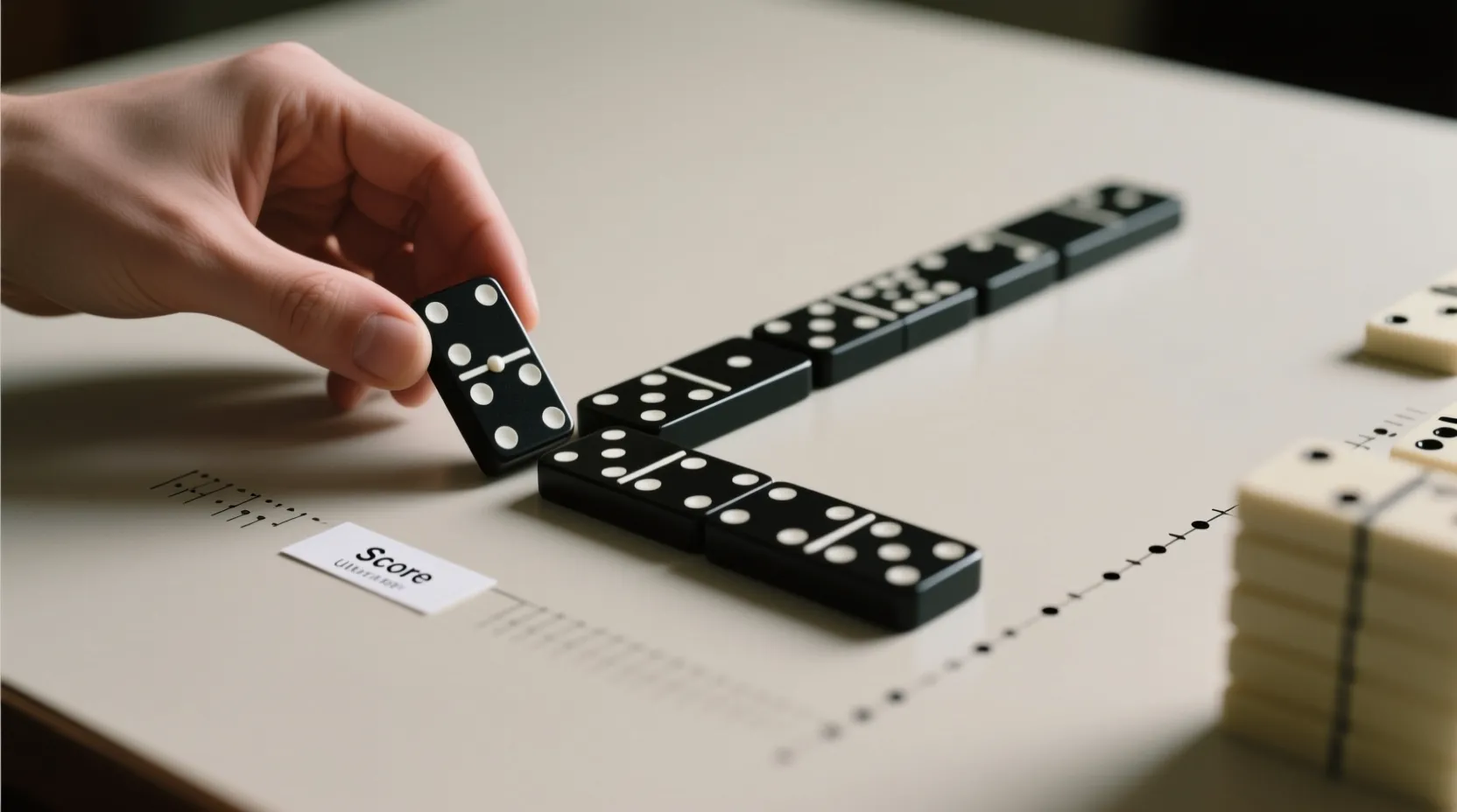 A ogni tessera giocata sembrerebbe che il totale dei puntini sul tavolo aumenti. Ma non è così semplice. Quando un’estremità con un certo numero di puntini si “aggancia” a un’estremità uguale già in gioco, quei due valori si annullano tra loro: non contribuiscono più al conteggio. Solo le estremità libere — quelle non collegate a un valore identico — contano per il punteggio del turno.